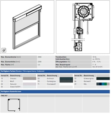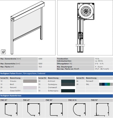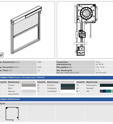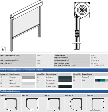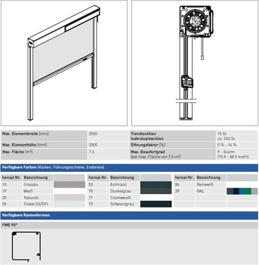 Technik: Innovative Zip-Reißverschlussführung für maximale Tuchstabilität. Wahlweise per Motor oder Handkurbel betrieben; beschattet Flächen bis zu 18 m² (6 m Breite).